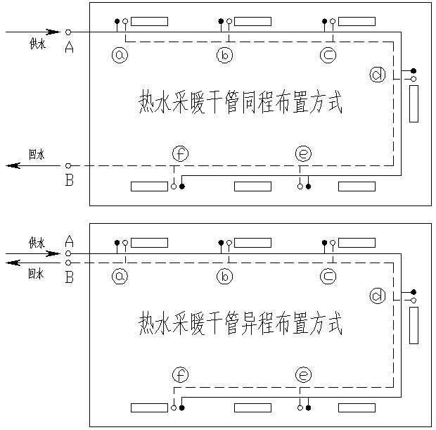 2、而在下圖的異程系統(tǒng)中,供水與回水主管中熱媒的流動方面則是一致的。供水由A點起經(jīng)a立管至B點的距離遠大于由A點經(jīng)f點立管至B點的距離,將產(chǎn)生各環(huán)路阻力不平衡的現(xiàn)象,設(shè)計人員通常會采用選擇管徑和設(shè)調(diào)節(jié)閥門等措施來降低這種不平衡的弊端,如果不采用這些措施,必然會造成從a立管向f立管散熱量逐次降低的問題。盡管從理論上看,異程系統(tǒng)不如同程系統(tǒng)來得合理,但由于異程系統(tǒng)回水主管簡短,在一定程度上節(jié)約了初投資,而且在施工時可以采用共架敷設(shè)(因供回水主管坡向一致),易于施工,所以實際采用較多。