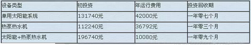 日照充足的時(shí)候用太陽能,日照不足的使用使用熱泵輔助加熱,兩套系統(tǒng)相結(jié)合,所需要的工程費(fèi)用為84500+65000+47240=196740元