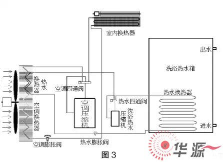 熱泵三聯(lián)供系統(tǒng),概念新穎,所謂空調(diào)模式運(yùn)行時(shí)可以加熱洗浴熱水,購(gòu)買一套三聯(lián)供設(shè)備,可以實(shí)現(xiàn)室內(nèi)制冷、供暖及洗浴熱水??梢越档筒糠殖跬顿Y,但運(yùn)行費(fèi)用與空調(diào)加空氣源熱泵熱水機(jī)的運(yùn)行費(fèi)用是相同的。如下圖2所示: