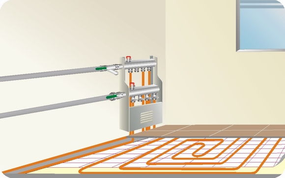 低溫熱水地板采暖,是將加熱管埋設在地板中,以溫度不高于60℃的熱水為熱媒,加熱地面,并以此地面為散熱面,在加熱周圍空氣的同時,還與四周的圍護結構進行輻射換熱,從而使室內空氣和四周的圍護結構表面溫度升高的一種采暖方式。